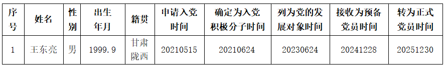 根据《中国共产党章程》《中国共产党发展党员工作细则》及《中共太阳成tyc7111cc集团委员会发展党员工作实施细则》的规定,经本人申请、党支部征求意见、支部委员会审查、学院党委审查和党支部大会讨论决议,决定王东亮同志转为正式党员。现将有关情况公示如下: