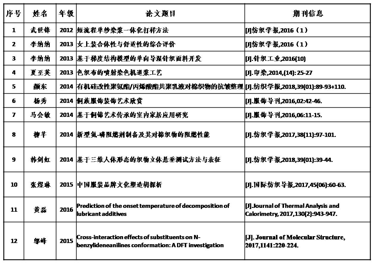 六年来,纺织工程硕士学位点研究生共发表(含收录)论文总数84篇,其中中文核心、A类期刊28篇,SCI收录论文2篇,EI收录论文5篇。申请专利14项,其中发明专利4项,实用新型10项,已授权11项。部分论文和专利摘录如下——