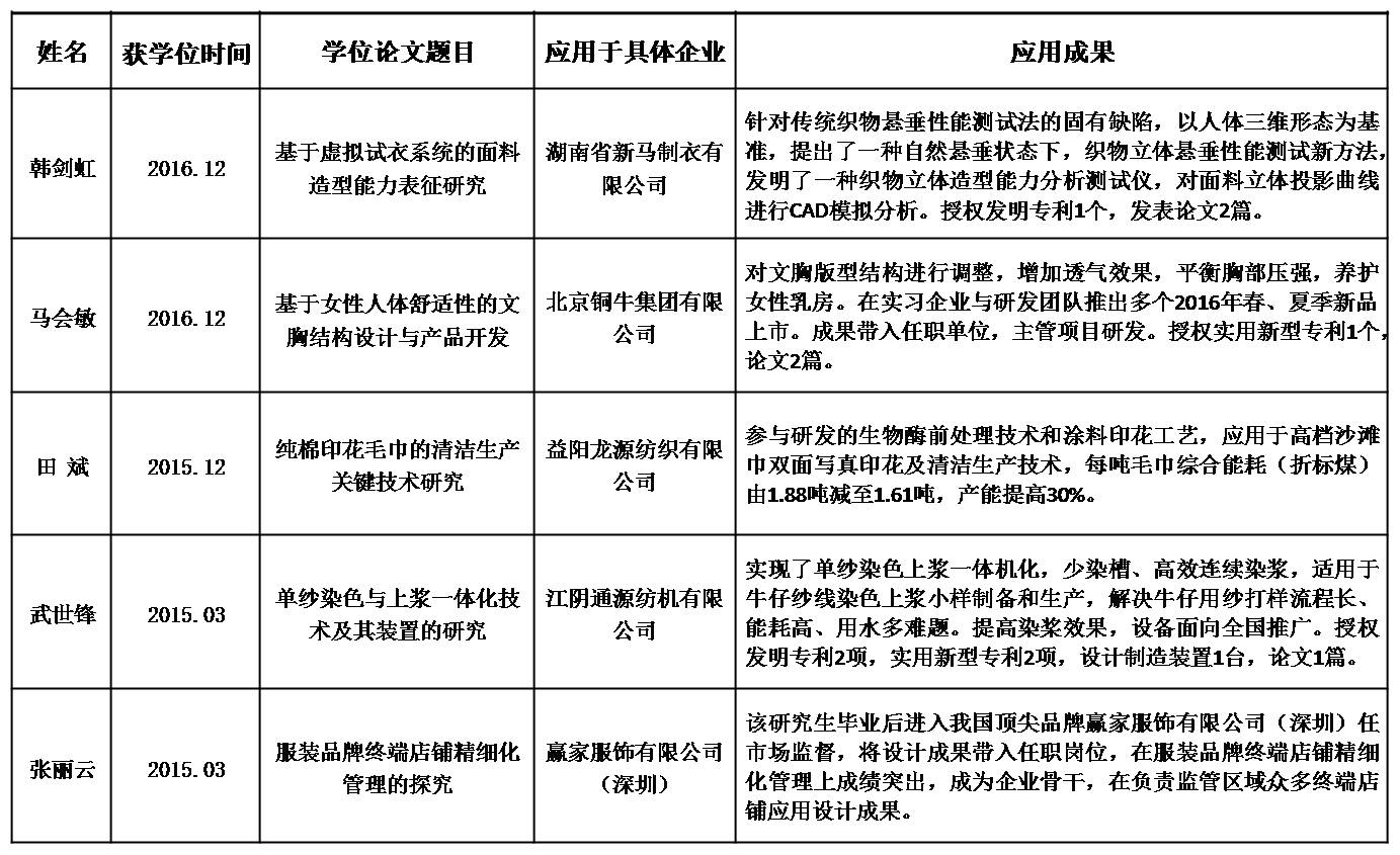 硕士研究生学位论文选题一般针对纺织行业领域实际问题展开,以应用为导向实现学位论文形式和评审的多元化,其中应用研究类占72%,产品开发类占24%,工程设计类占4%。目前,本学位点研究生共有优秀硕士论文培育项目5项,研究成果直接为企业应用,有利地促进了企业节能降耗、产品质量提升、技术改造升级,实现了较好的经济效益和社会效益。