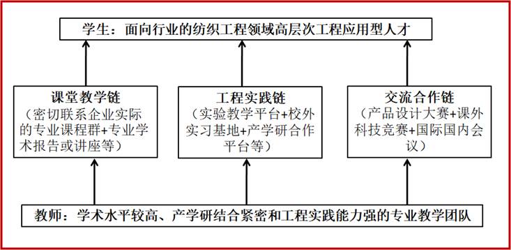 坚持“以实践为导向、以企业紧缺人才培养为目标”的原则,遵循“从理论到实践再到理论”螺旋递进的培养方式,强调企业实践必须与理论学习紧密结合并贯穿于整个培养过程。积极吸取国内外高层次工程应用型人才教育培养的经验,改变学校过去以课堂教学为主的单线条式的教学模式,依托行业,联合企业合作培养适应环境友好、资源节约“两型”社会所需要的纺织工程领域高素质、高层次应用型人才。充分发挥我校纺织工程领域学科专业群的比较优势,以学校与企业联合组建的学术水平高、工程实践能力强、教育经验丰富的教学团队为保障,以紧密结合工程实际的专业课程群为课堂教学链,以省级实验教学示范中心、规模化校外实习基地、产学研合作平台和各类专业实验室等为工程实践链,以国内纺织类产品设计大赛、课外科技竞赛、国内外学术会议、校企科研合作与职工培训等为交流合作链,创建立体化、开放式的纺织工程硕士专业学位人才培养体系(见下图)。