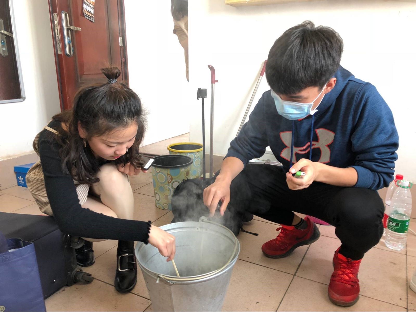 学生干部首先在空旷的地方和宿舍走道点燃了艾叶与苍术,并覆灭桶内明火、形成烟雾,再一一提到学生宿舍,进行封闭式的5-10分钟消毒,熏艾结束后再将宿舍门窗打开通风,并告知宿舍同学适当的熏艾可以抑制和杀伤病毒,对呼吸系统疾病的防治也有一定作用。