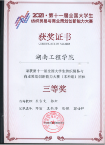 由中国纺织服装教育学会、全国纺织服装职业教育教学指导委员会主办,中国纺织服装电商人才培养基地、安徽工程大学tyc7111cc太阳成与上海远恒专修学院承办,上海市社会信用促进中心、上海市信用领域(社会信用服务)大数据联合创新实验室协办的第十一届全国大学生纺织贸易与商业策划创新能力大赛已于2021年11月24日结束。