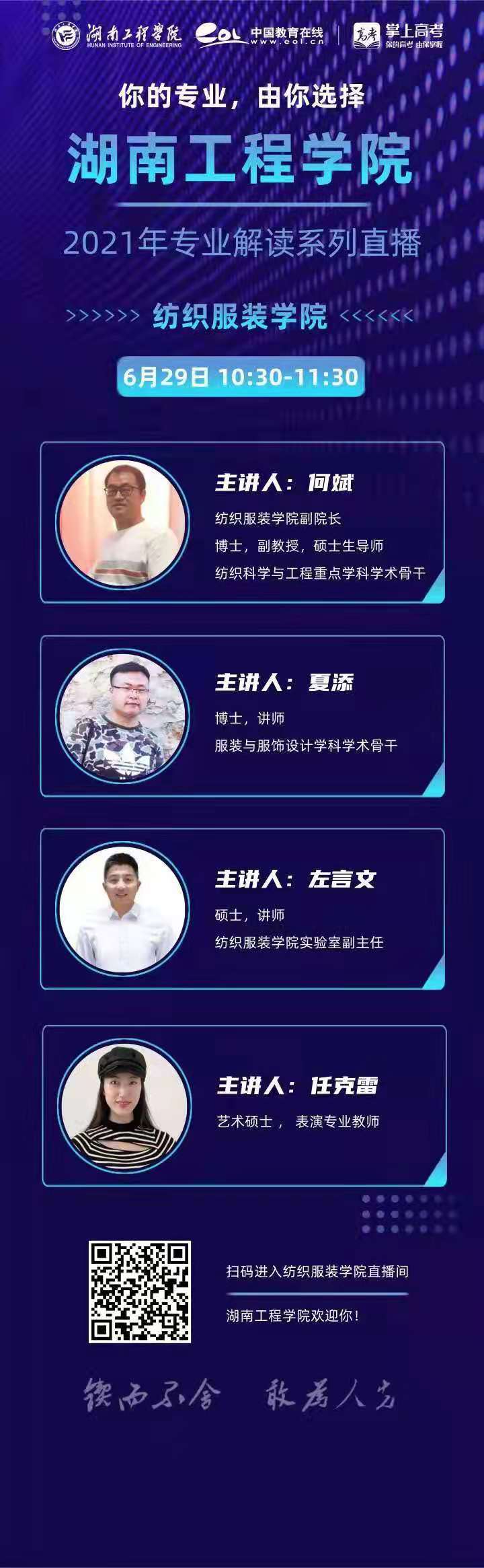 tyc7111cc太阳成于6月29日参加了由太阳成tyc7111cc集团、中国教育在线网和掌上高考平台共同举办的专业解读系列直播。何斌副院长、各教研室主任、三位专业教师:夏添、左言文、任克雷参与本次直播的主讲和专业答疑。