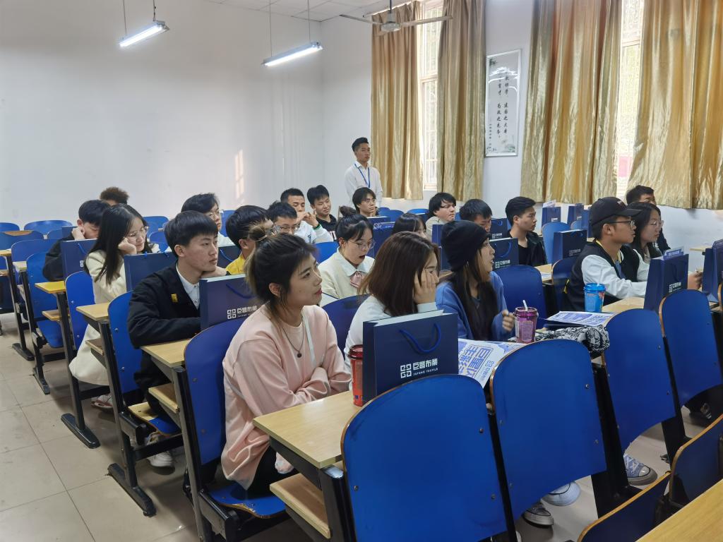 会上,主讲人用PPT向同学们展示并详细介绍了企业规章制度、福利待遇、企业文化、现有产业结构、人力资源等方面。随后,17级纺织工程专业毕业生曹钦同学分享了他加入巨丰布业的学习成长经历与对公司的认识,并简单介绍了公司情况,并真诚地邀请同学们能够加入巨丰这个大家庭。
