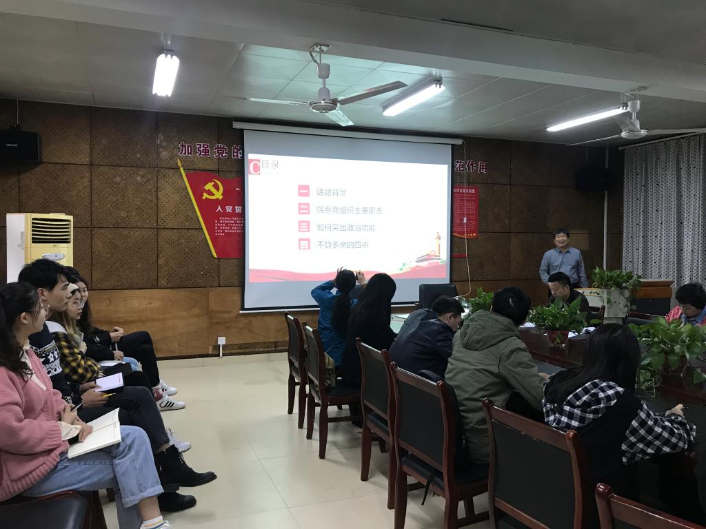 为进一步增强党员党性观念, 10月25日上午,tyc7111cc太阳成党总支在电教201开展了“加强政治建设,突出政治功能”主题党课。我院全体师生党员参加了本次学习活动。党课由tyc7111cc太阳成党总支书记李爱国担任主讲。