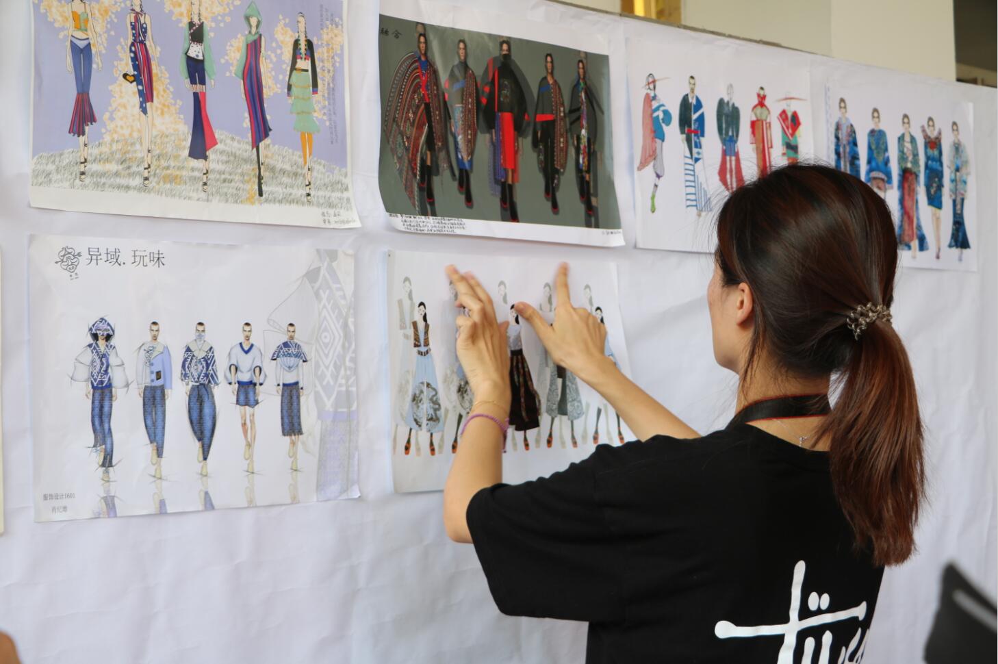 近日,我院服装与服饰设计专业2016级学子于北校区红楼前筹备民族服饰考察与写生作品展。学生们顶着炎炎烈日将近200幅风景与人物速写、民族服饰设计效果图、摄影照片等实践教学环节作业一一装裱、陈列。据悉,本次作品展出的所有作品均是学生们赴云南进行《民族服饰考察与写生》实践学习的课程作业。该实践教学环节旨在让学生们通过实地考察、走访少数民族居住集聚地区,深入了解各少数民族的服饰风格特点,学习服饰历史文化,感受民族服饰物质与非物质遗产精神,积淀服装与服饰设计创作底蕴,同时为以后的设计活动搜集真实、丰富的原始创作素材。