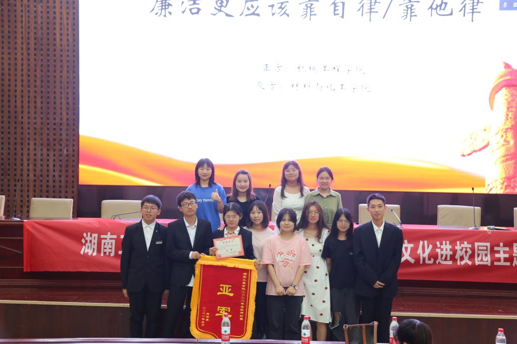总决赛由正方机械工程学院与反方材料与化工学院就“廉洁更应该靠自律还是他律”为辩题展开辩论。赛场上辩论双方各抒己见,抓住对方逻辑漏洞,集中展开攻势,两方辩手你来我往、思路清晰、引经据典、慷慨激昂,妙语连珠引得台下掌声连连。